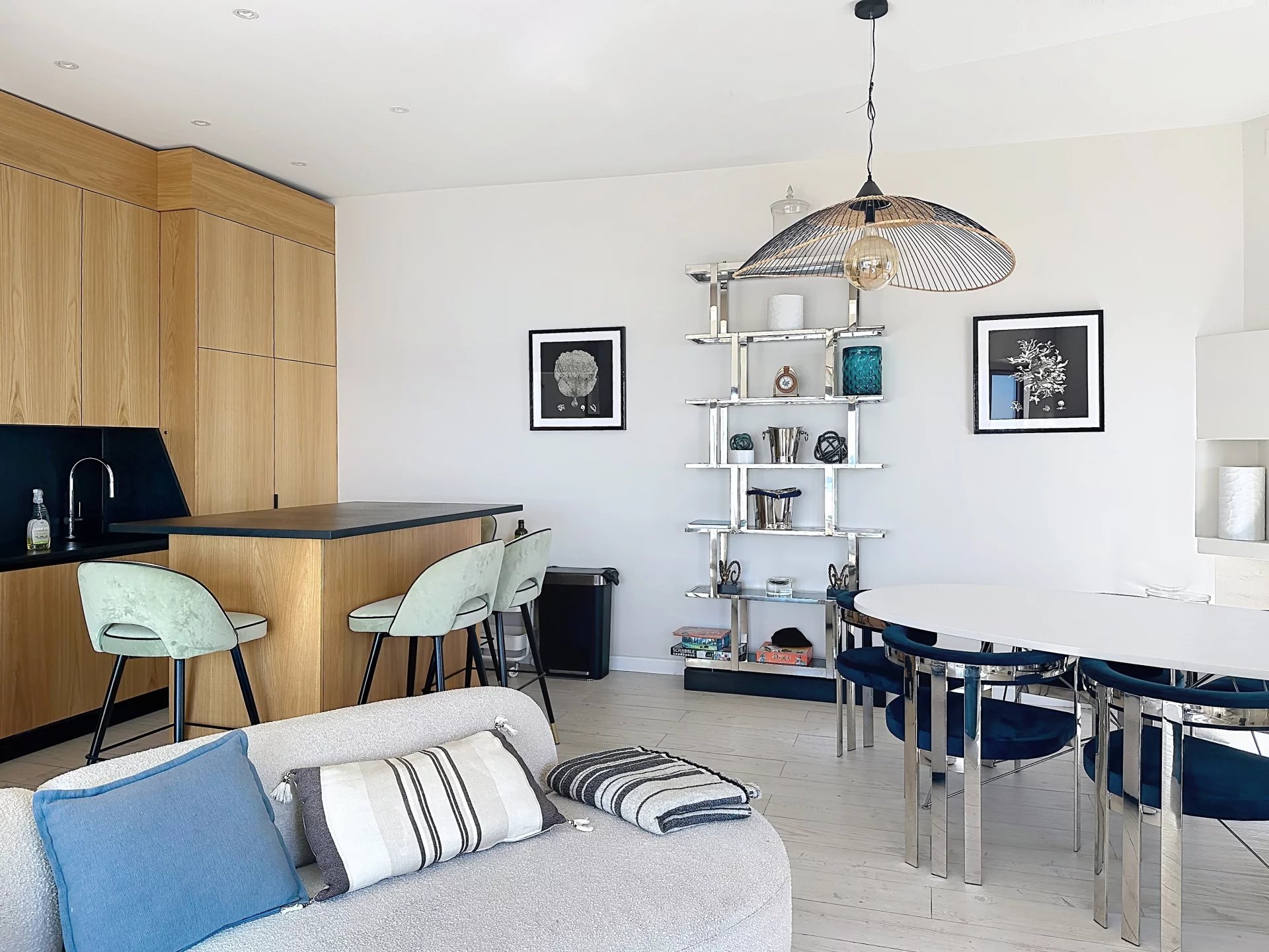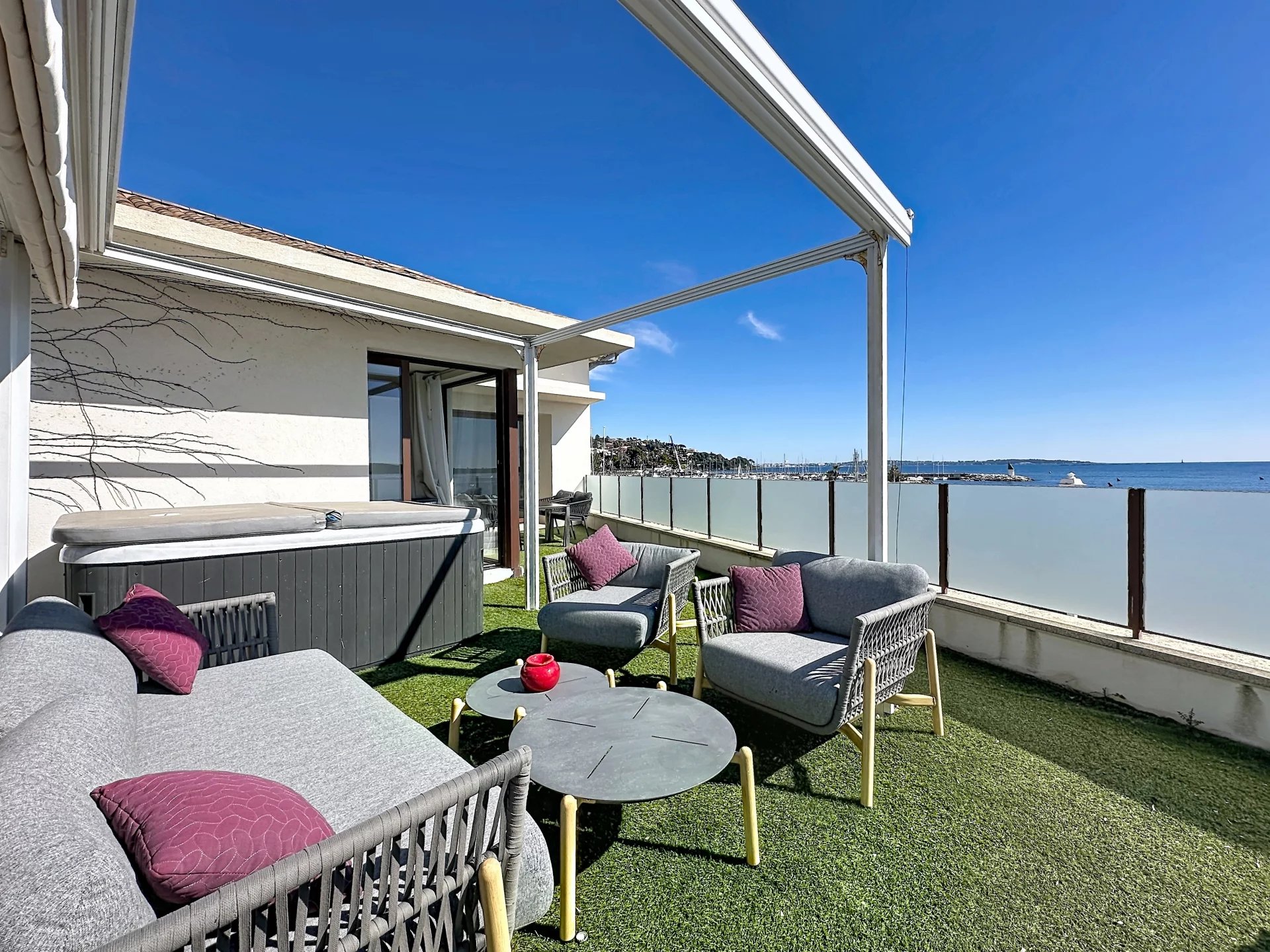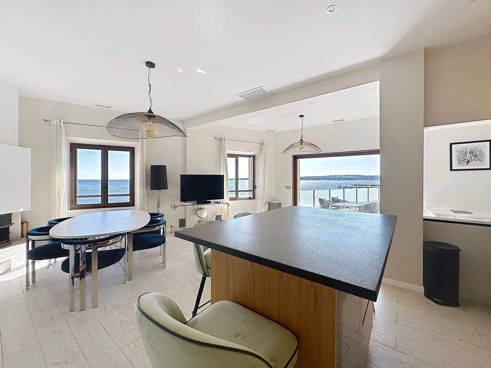 Une maison de 166 m² comprenant 5 chambres avec chacune leur salle d'eau et toilette, une pièce à vivre et sa cuisine US, avec vue mer du cap d'Antibes aux îles, une terrasse avec jacuzzi pratiquement posée sur l'eau... de quoi ravir vos moments solo, familiaux ou entre amis !